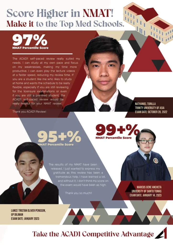 Prepare for your medical journey with Acad1's NMAT Review Program—designed to equip aspiring medical professionals with the knowledge and strategies needed to excel in the National Medical Admission Test. Our program offers in-depth discussions on key subjects, practice exams modeled after the actual test, and expert guidance to help you achieve top scores. With Acad1, you'll gain the confidence and skills to secure your spot in the country's leading medical schools.